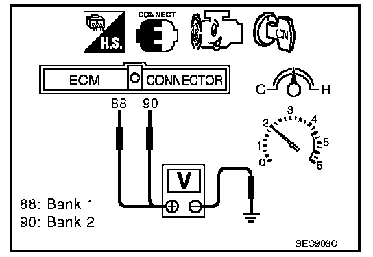 5. Set voltmeter probes between ECM terminal 88 [HO2S2 (B1) signal] or 90 [HO2S2 (B2) signal] and engine ground.