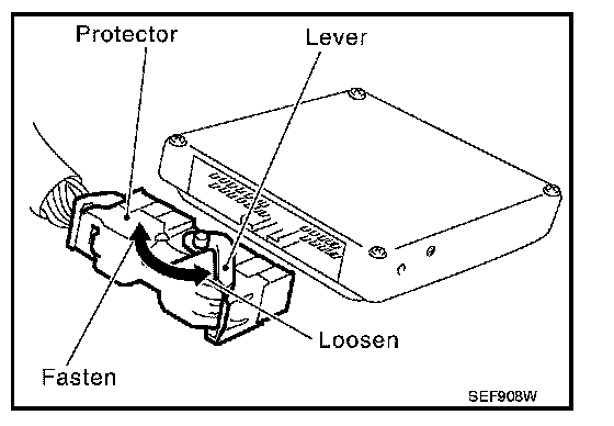 - When connecting ECM harness connector, fasten it securely with a lever as far as it will go as shown in the figure.