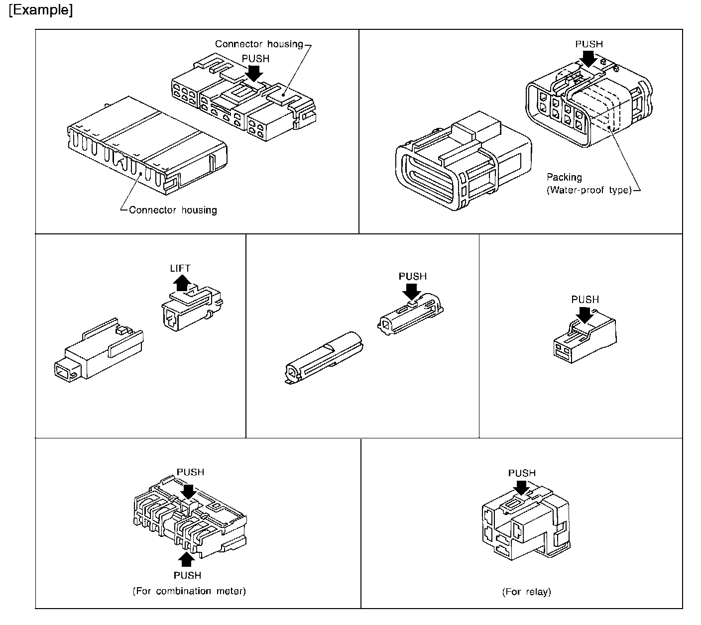 - The tab-locking type connectors are disconnected by pushing or lifting the locking tab(s). Refer to the illustration.