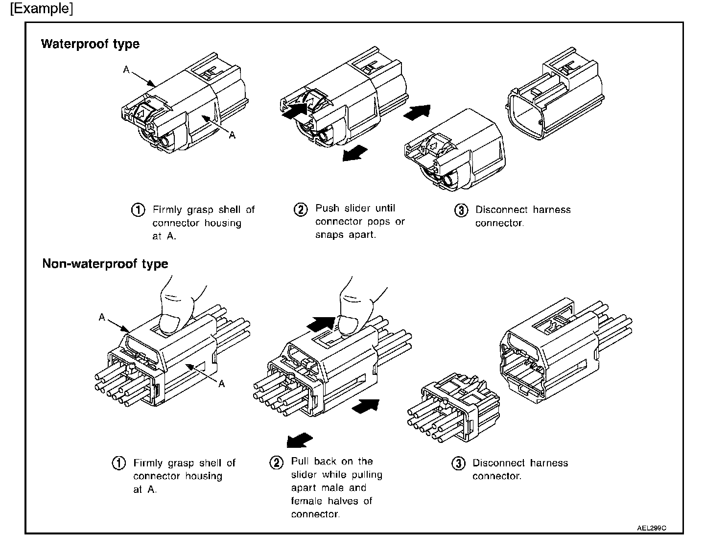 - Do not pull the harness or wires when disconnecting the connector.