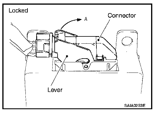 - For removal of the lever type connector, pull the lever up to the direction pointed to by the arrow A in the figure, and then remove the connector.