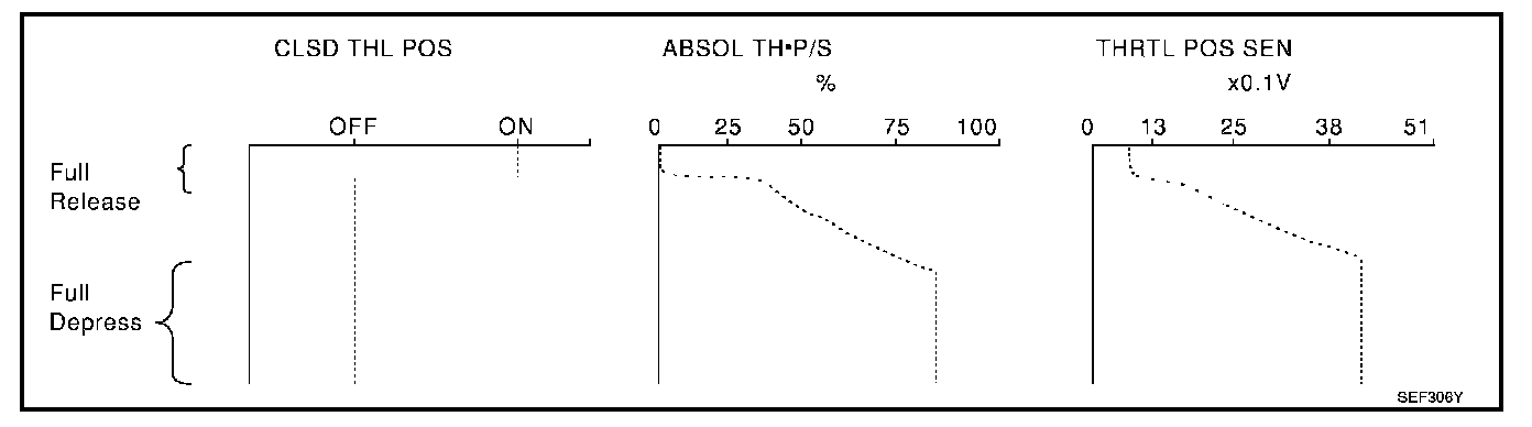 Below is the data for "THRTL POS SEN", "ABSOL TH�P/S" and "CLSD THL POS" when depressing the accelerator pedal with the ignition switch ON.