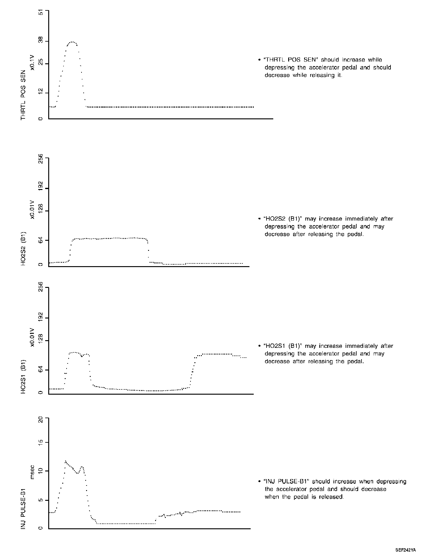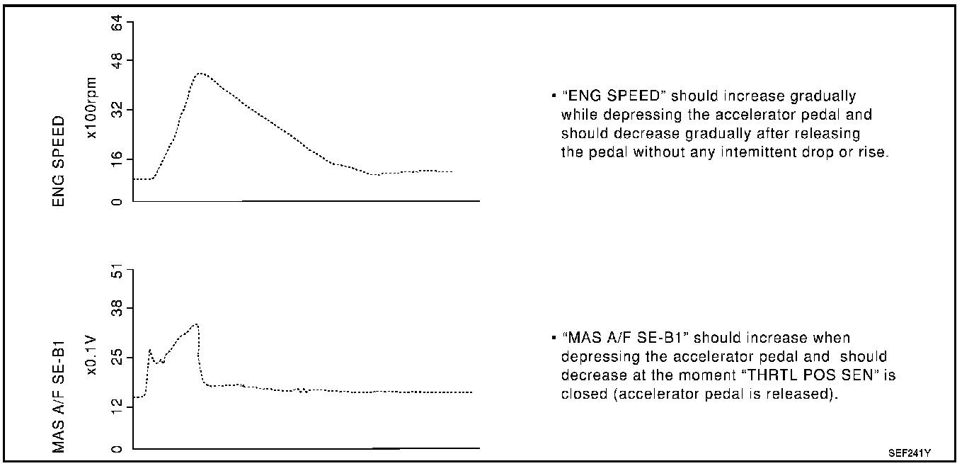 The signal of "THRTL POS SEN" and "ABSOL TH�P/S" should rise gradually without any intermittent drop or rise after "CLSD THL POS" is changed from "ON" to "OFF".