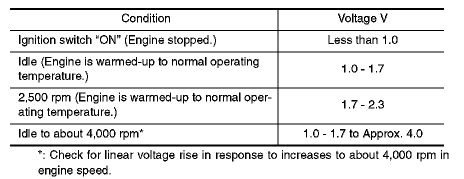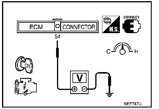 3. Check voltage between ECM terminal 54 (Mass air flow sensor signal) and ground.