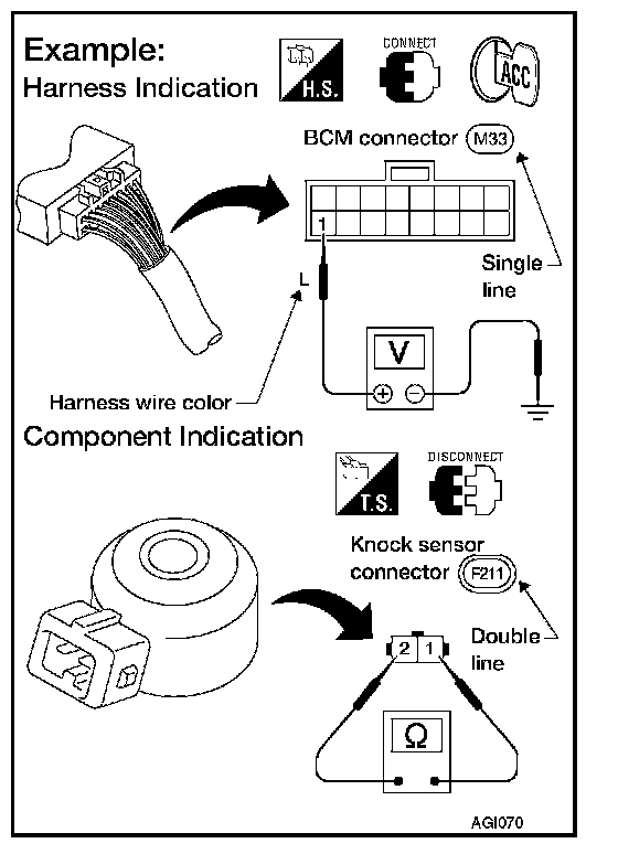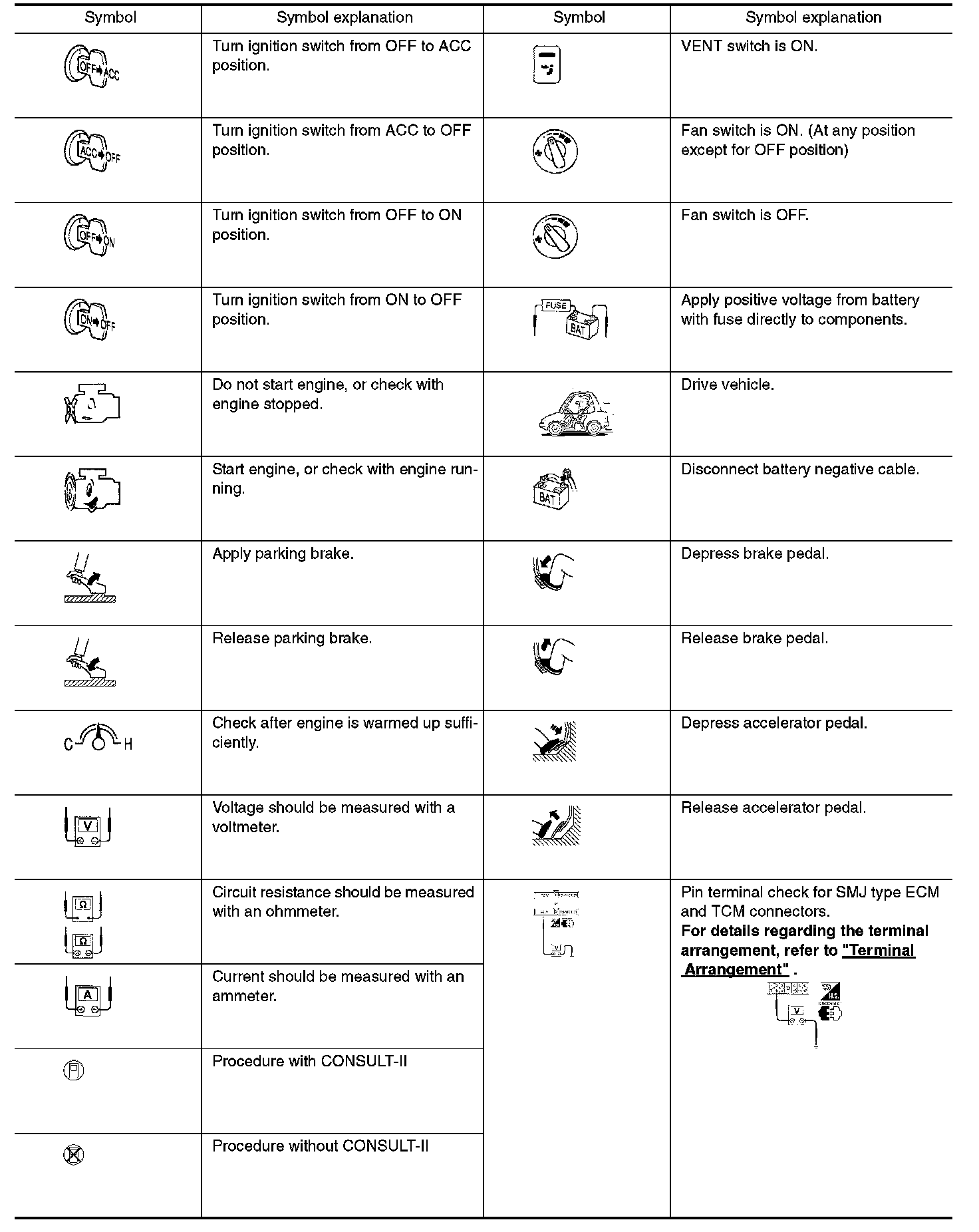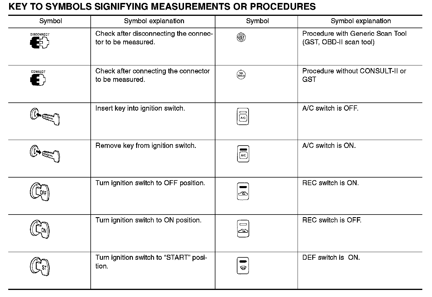 Symbols included in illustrations refer to measurements or procedures. Before diagnosing a problem, familiarize yourself with each symbol. Refer to "Connector Symbols" and "KEY TO SYMBOLS SIGNIFYING MEASUREMENTS OR PROCEDURES".