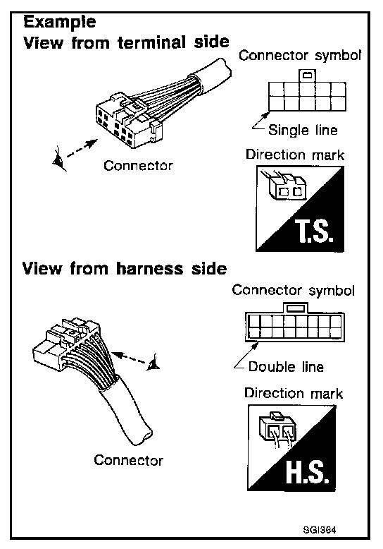 - Connector symbols shown from the harness side are enclosed by a double line and followed by the direction mark.