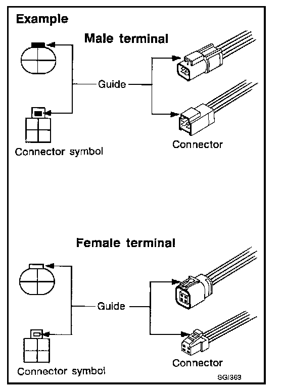 Connector guides for male terminals are shown in black and female terminals in white in wiring diagrams.