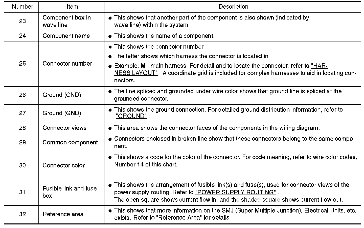 In a wiring diagram, the SMJ connectors include a letter of the alphabet in the terminal number. SMJ connector numbers are shown in the Reference Area of the wiring diagram. SMJ terminal arrangement can be found on the electrical reference pages at the end of the manual. For terminal arrangement of these connectors, refer to the "SMJ (SUPER MULTIPLE JUNCTION)" electrical reference.