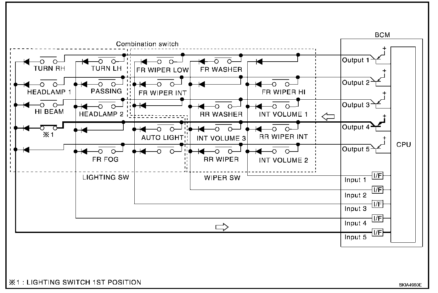 - When lighting switch 1st position is turned ON, contact in combination switch turns ON. At this time if OUTPUT 4 transistor is activated, BCM detects that voltage changes in INPUT 5.