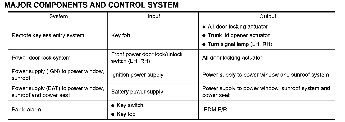 BCM has a combination switch reading function for reading the operation of combination switches (light, wiper washer, turn signal) in addition to the function for controlling the operation of various electrical components. Also, it functions as an interface that receives signals from the A/C control unit (with manual A/C), A/C auto amplifier (with auto A/C), and sends signals to ECM using CAN communication.