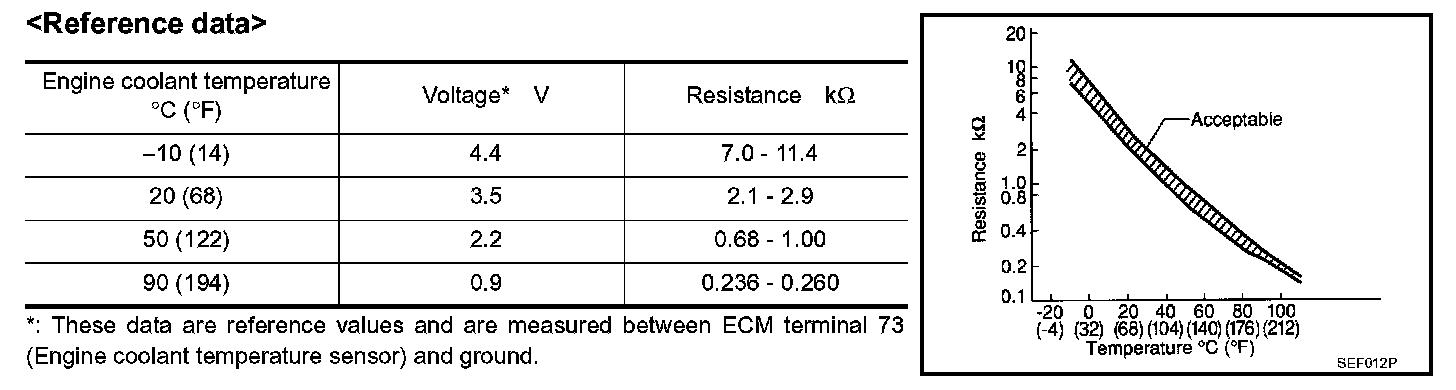 The engine coolant temperature sensor is used to detect the engine coolant temperature. The sensor modifies a voltage signal from the ECM. The modified signal returns to the ECM as the engine coolant temperature input. The sensor uses a thermistor which is sensitive to the change in temperature. The electrical resistance of the thermistor decreases as temperature increases.