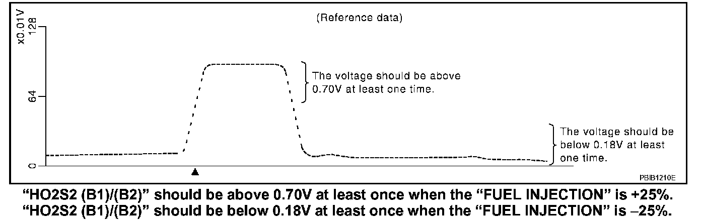 7. Check "HO2S2 (B1)/(B2)" at idle speed when adjusting "FUEL INJECTION" to ±25%.