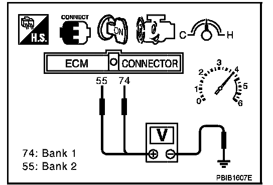 5. Set voltmeter probes between ECM terminal 74 [HO2S2 (B1) signal] or 55 [HO2S2 (B2) signal] and engine ground.