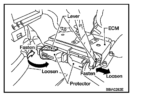 - When connecting ECM harness connector, fasten it securely with levers as far as they will go as shown in the figure.
