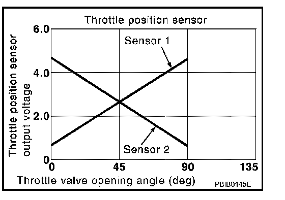The throttle position sensor has the two sensors. These sensors are a kind of potentiometers which transform the throttle valve position into output voltage, and emit the voltage signal to the ECM. In addition, these sensors detect the opening and closing speed of the throttle valve and feed the voltage signals to the ECM. The ECM judges the current opening angle of the throttle valve from these signals and the ECM controls the throttle control motor to make the throttle valve opening angle properly in response to driving condition.