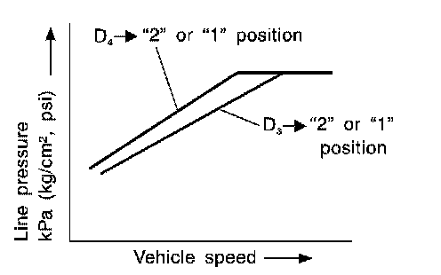 If the selector lever is shifted to 2nd position while driving in D4 (O/D) or D3, great driving force is applied to the clutch inside the transmission. Clutch operating pressure (line pressure) must be increased to deal with this driving force.