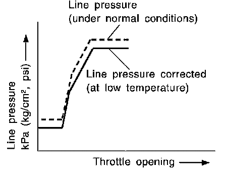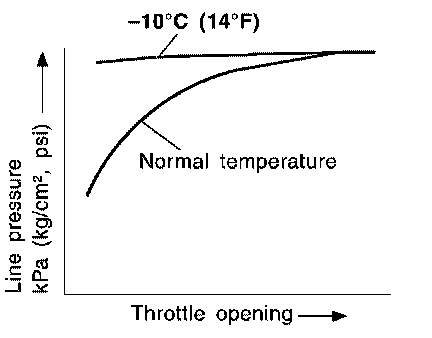 ^ Line pressure is increased to a maximum irrespective of the throttle opening when fluid temperature drops to -10°C (14°F). This pressure rise is adopted to prevent a delay in clutch and brake operation due to extreme drop of fluid viscosity at low temperature.