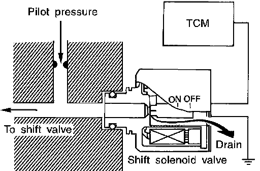The shift solenoid valve performs simple ON-OFF operation. When set to ON, the drain circuit closes and pilot pressure is applied to the shift valve.