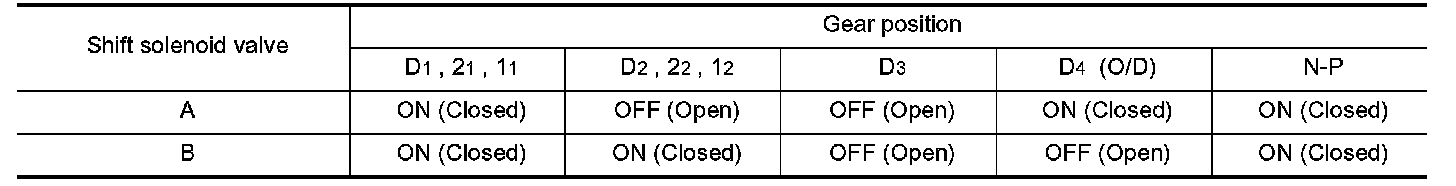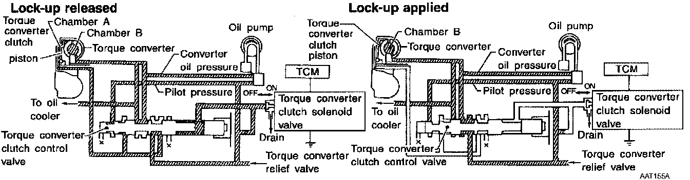 The torque converter clutch piston in the torque converter is locked to eliminate torque converter slip to increase power transmission efficiency. The solenoid valve is controlled by an ON-OFF duty signal sent from the TCM. The signal is converted to an oil pressure signal which controls the lock-up piston.