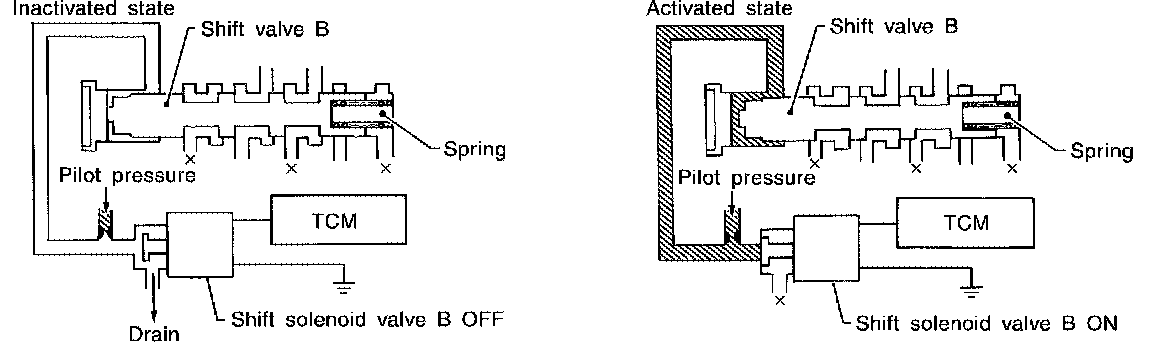 The drawing above shows the operation of shift valve B. When the shift solenoid valve is ON, pilot pressure applied to the end face of the shift valve overcomes spring force, moving the valve upward.