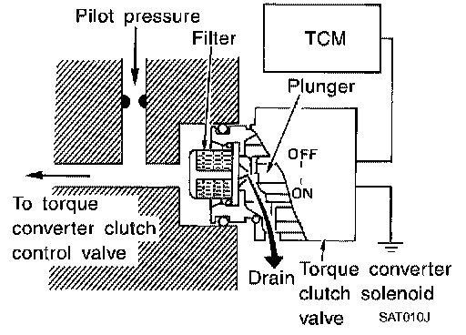 The torque converter clutch solenoid valve is controlled by the TCM. The plunger closes the drain circuit during the OFF period, and opens the circuit during the ON period. If the percentage of OFF-time increases in one cycle, the pilot pressure drain time is reduced and pilot pressure remains high.