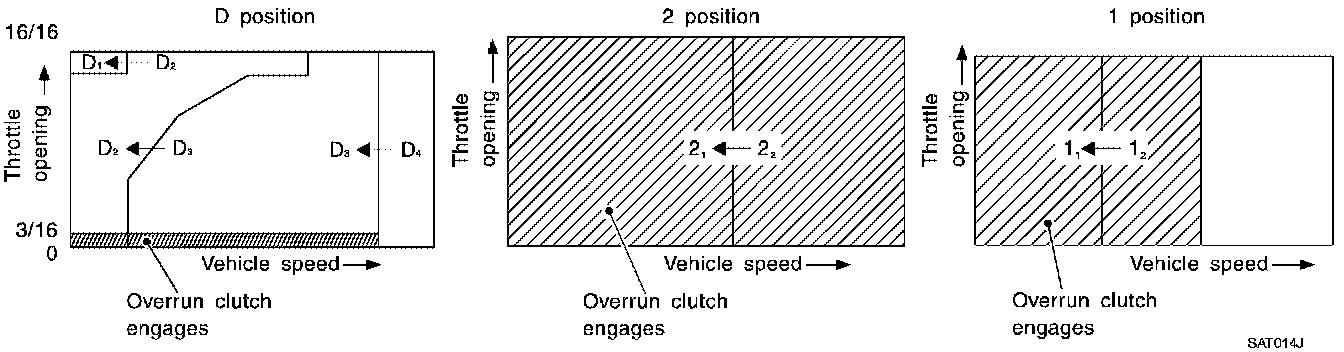 The shift is regulated entirely by electronic control to accommodate vehicle speed and varying engine operations. This is accomplished by electrical signals transmitted by the revolution sensor and the ECM (throttle opening). This results in improved acceleration performance and fuel economy.