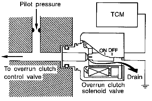 The overrun clutch solenoid valve is operated by an ON-OFF signal transmitted by the TCM to provide overrun clutch control (engine brake control).