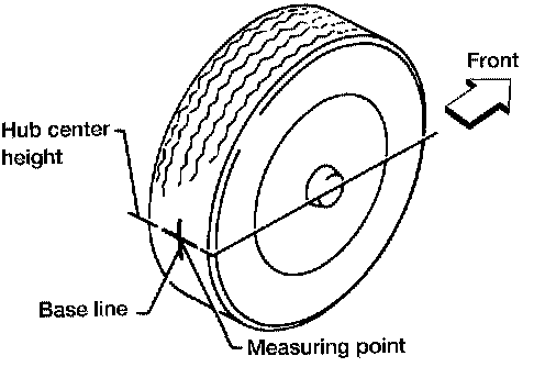 3. Put a mark on base line of the tread (rear side) of both front tires at the same height as hub center as shown. These marks are measuring points.