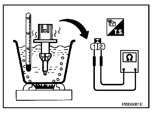 1. Check resistance between engine coolant temperature sensor terminals 1 and 2 as shown in the figure.