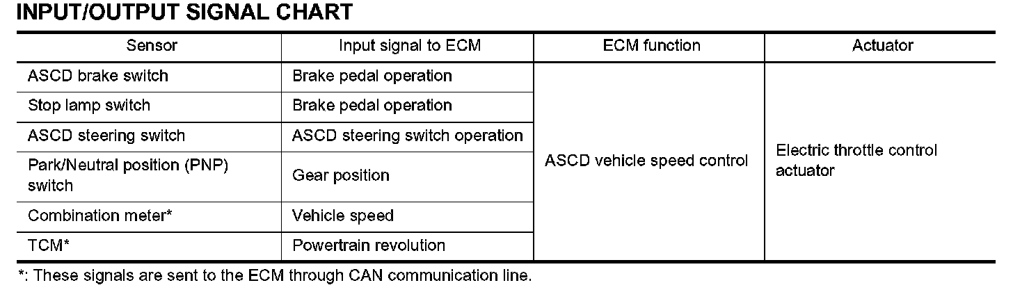 When the SET/COAST switch is depressed during cruise control driving, decrease vehicle set speed until the switch is released. And then ASCD will keep the new set speed.