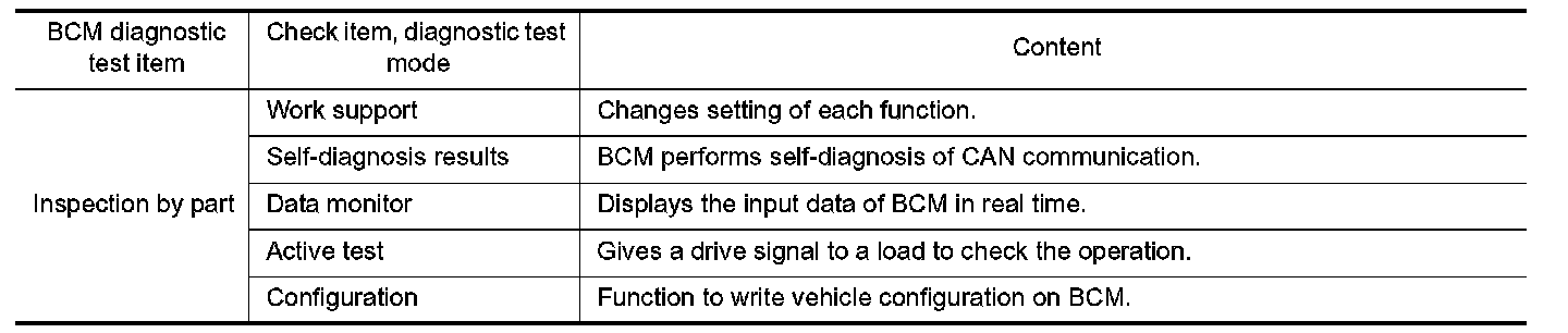 CONSULT-IICONSULT-II can display each diagnostic item using the following diagnostic test modes: work support, self-diagnosis results, data monitor and active test through data reception and command transmission via the BCM CAN communication lines.