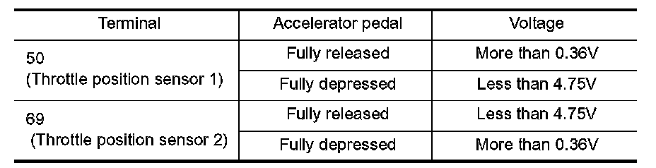 5. Check voltage between ECM terminals 50 (TP sensor 1 signal), 69 (TP sensor 2 signal) and body ground under the given conditions.