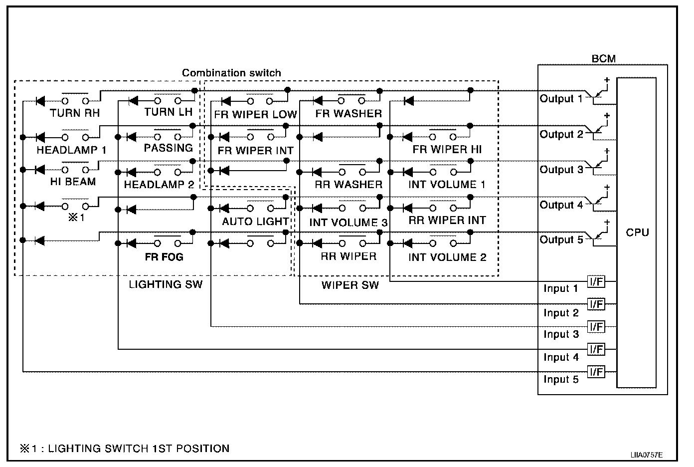 - BCM reads information of a maximum of 20 switches by combining five output terminals (OUTPUT 1-5) and five input terminals (INPUT 1-5).