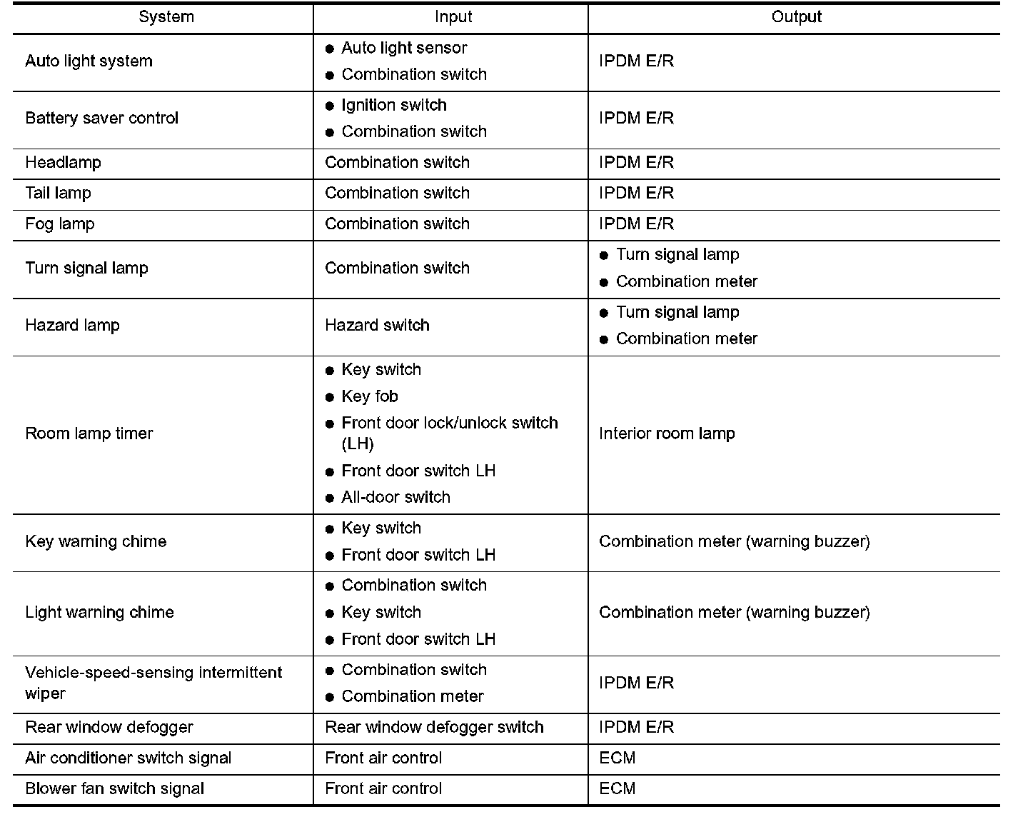 BCM has a combination switch reading function for reading the operation of combination switches (light, wiper washer, turn signal) in addition to the function for controlling the operation of various electrical components. Also, it functions as an interface that receives signals from the A/C control unit, and sends signals to ECM using CAN communication.