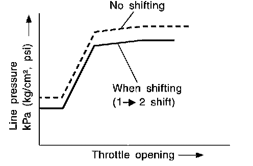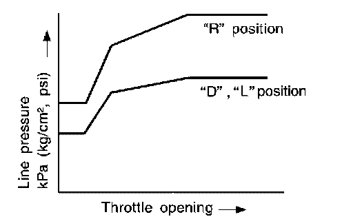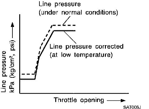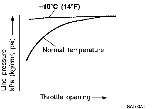 Line pressure is increased to a maximum irrespective of the throttle opening when fluid temperature drops to -10°C (14°F). This pressure rise is adopted to prevent a delay in clutch and brake operation due to extreme drop of fluid viscosity at low temperature.