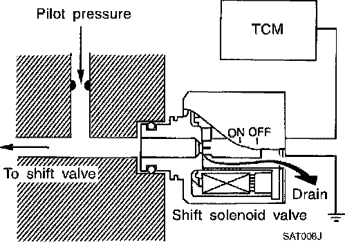 The shift solenoid valve performs simple ON-OFF operation. When set to ON, the drain circuit closes and pilot pressure is applied to the shift valve.