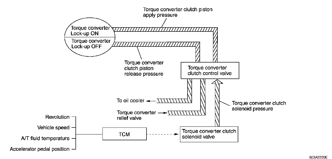 The torque converter clutch piston in the torque converter is locked to eliminate torque converter slip to increase power transmission efficiency. The solenoid valve is controlled by an ON-OFF duty signal sent from the TCM. The signal is converted to an oil pressure signal which controls the lock-up piston.