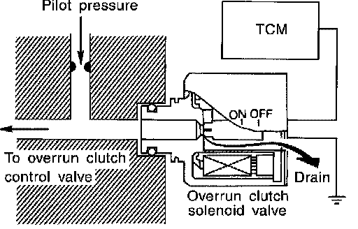 The overrun clutch solenoid valve is operated by an ON-OFF signal transmitted by the TCM to provide overrun clutch control (engine brake control).
