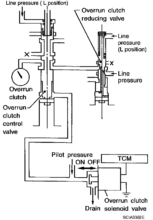 When the solenoid valve is ON, pilot pressure is applied to the overrun clutch control valve. This pushes up the overrun clutch control valve. The line pressure is then shut off so that the clutch does not engage.