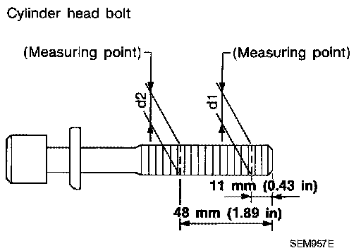 CAUTION: Cylinder head bolts are tightened by degree rotation tightening method. Whenever the size difference between d1 and d2 exceeds the limit, replace the bolts with new ones.