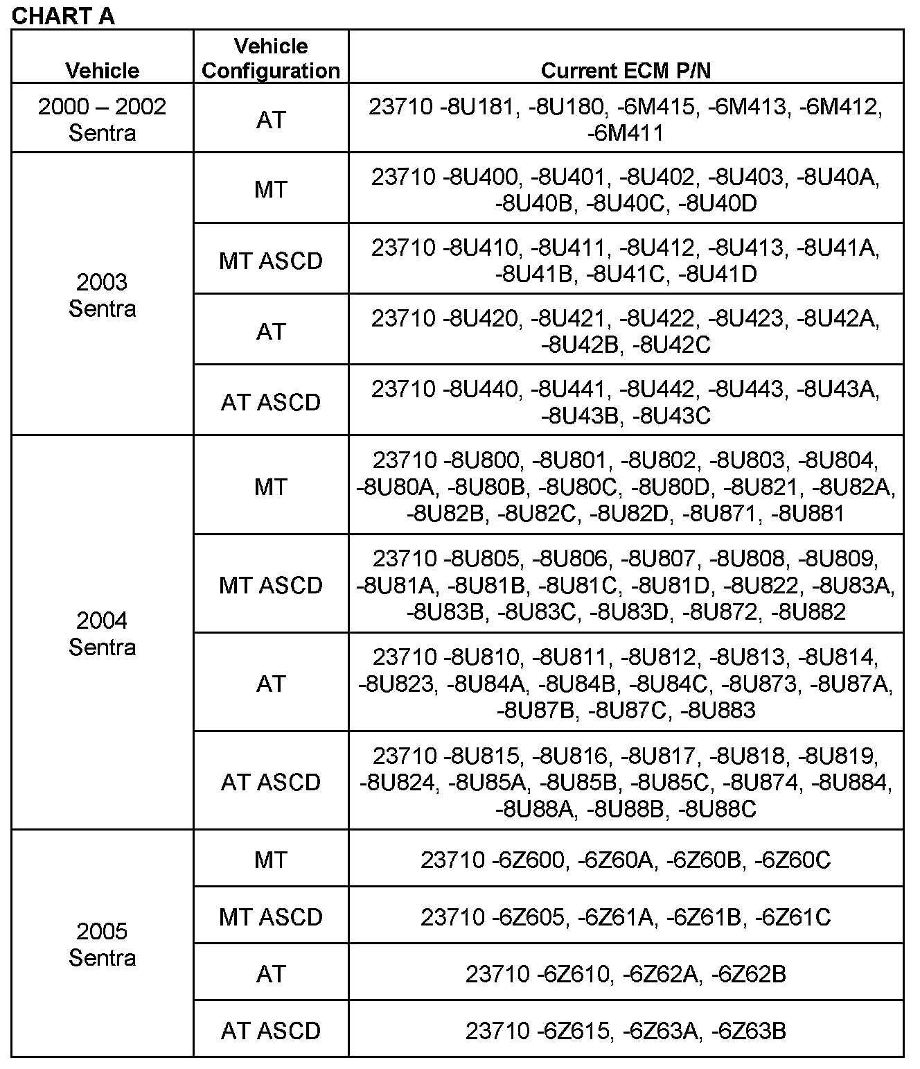 ^ Compare the vehicle's current ECM P/N to those shown under Current ECM P/N in Chart A.