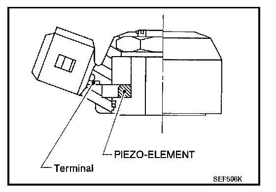 The knock sensor is attached to the cylinder block. It senses engine knocking using a piezoelectric element. A knocking vibration from the cylinder block is sensed as vibrational pressure. This pressure is converted into a voltage signal and sent to the ECM.