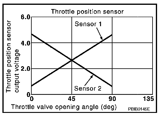 The throttle position sensor has the two sensors. These sensors are a kind of potentiometers which transform the throttle valve position into output voltage, and emit the voltage signal to the ECM. In addition, these sensors detect the opening and closing speed of the throttle valve and feed the voltage signals to the ECM. The ECM judges the current opening angle of the throttle valve from these signals and the ECM controls the throttle control motor to make the throttle valve opening angle properly in response to driving condition.