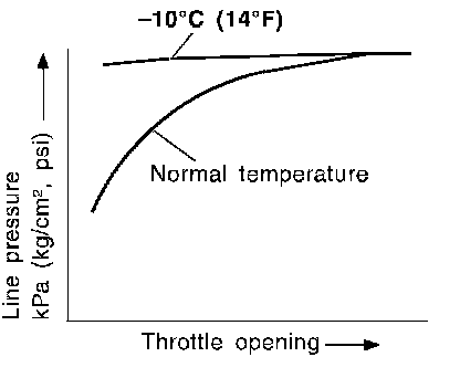 ^ Line pressure is increased to a maximum, irrespective of the throttle opening, when fluid temperature drops to -10°C (14°F). This pressure rise is adopted to prevent a delay in clutch and brake operation due to extreme drop of fluid viscosity at low temperature.