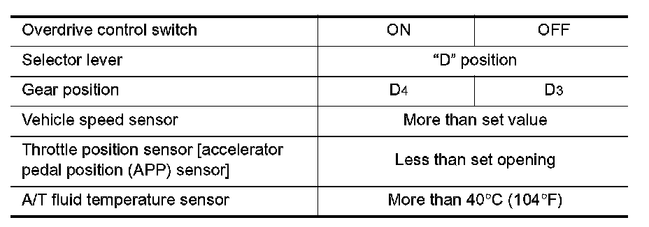 ^ The line pressure is reduced below 60°C (140°F)to prevent shifting shock due to low viscosity of automatic transmission fluid when temperature is low.