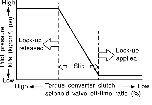 The torque converter clutch piston in the torque converter is locked to eliminate torque converter slip to increase power transmission efficiency. The solenoid valve is controlled by an ON-OFF duty signal sent from the TCM. The signal is converted to an oil pressure signal which controls the torque converter clutch piston.