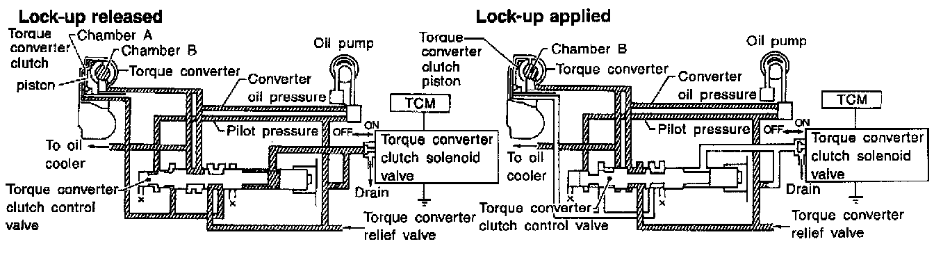 When the OFF-duration of the torque converter clutch solenoid valve is short, pilot pressure drains and becomes low. Accordingly, the control valve moves to the right by the pilot pressure of the other circuit and converter pressure. As a result, converter pressure is applied to chamber B. keeping the torque converter clutch piston applied.