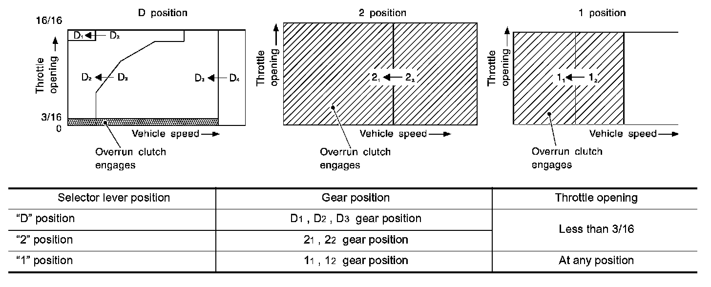 If the selector lever is shifted to "2" position while driving in Do (OD) or Ds, great driving force is applied to the clutch inside the transmission. Clutch operating pressure (line pressure) must be increased to deal with this driving force.
