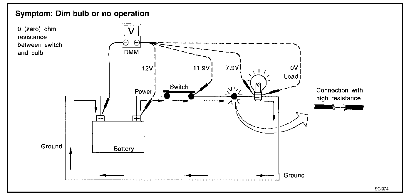 Check the wire in the illustration. When measuring resistance with DMM, contact by a single strand of wire will give reading of 0 ohms. This would indicate a good circuit. When the circuit operates, this single strand of wire is not able to carry the current. The single strand will have a high resistance to the current. This will be picked up as a slight voltage drop. Unwanted resistance can be caused by many situations as follows: