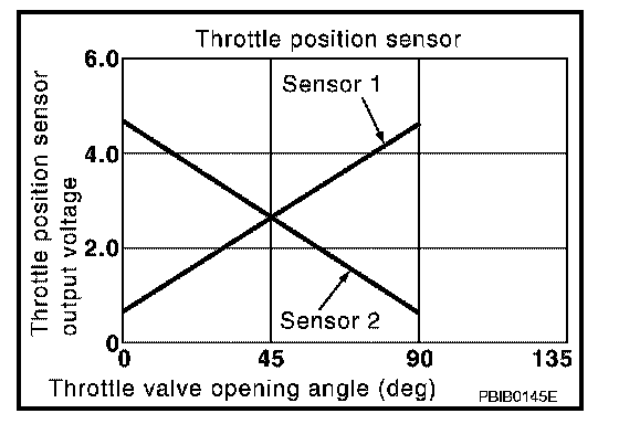The throttle position sensor has the two sensors. These sensors are a kind of potentiometers which transform the throttle valve position into output voltage, and emit the voltage signal to the ECM. In addition, these sensors detect the opening and closing speed of the throttle valve and feed the voltage signals to the ECM. The ECM judges the current opening angle of the throttle valve from these signals and the ECM controls the throttle control motor to make the throttle valve opening angle properly in response to driving condition.